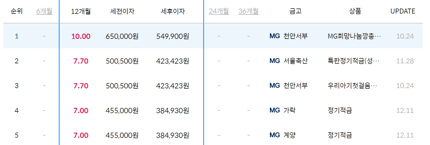 천안서부 지점은 전국의 새마을금고 중 가장 높은 금리인 10%를 제공하고 있습니다. 12개월 (1년) 가입 기준으로 매월 100만 원 적립 시, 세전이자는 65만 원(세후 약 54만 원)입니다.